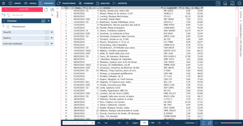 Les Monarch Data Prep Studiodonnées extraites d’un état sont consignées dans une table de base de données que vous pouvez consulter et manipuler dans la fenêtre Préparer de Monarch Data Prep Studio. Ce tableau se compose de lignes et de colonnes de données : chaque ligne représente un enregistrement de base de données et chaque colonne, un champ.