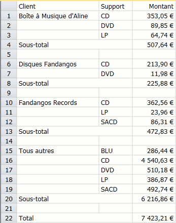 Récapitulatif dont le total des ventes est détaillé par type de support dans chaque champ Client.