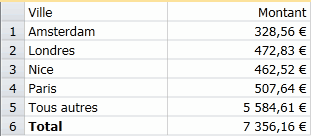 Utilisation des n premières valeurs pour une analyse des quatre meilleures villes commerciales. Le champ Ville est trié en ordre décroissant en fonction de la mesure Montant (des ventes).
