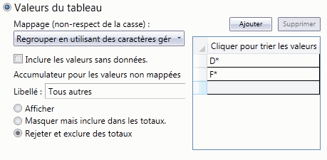 Le regroupement à l'aide de caractères génériques est quasiment identique à Correspondance exacte, à la différence que vous utilisez des caractères génériques pour spécifier les valeurs de clé à inclure. Ainsi, vous n'avez pas à saisir toutes les valeurs exactement.