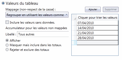 Cette option n’est activée que lorsque le champ clé est de type Date/heure. Lorsque cette option est sélectionnée, la zone d'affichage en lecture seule, à droite, liste les intervalles couvrant la plage de valeurs de date/heure actuellement présentes pour le champ-clé, sous filtrage applicable du récapitulatif. Il s'agit précisément de la plage qui sera appliquée au moment du calcul effectif du récapitulatif.
