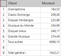Utilisation des n premières valeurs pour une analyse des cinq meilleurs clients. Le champ Client est trié en ordre décroissant en fonction de la mesure Montant (des ventes).