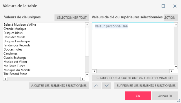 Sélectionnez une valeur ou toutes les valeurs dans le panneau Valeurs de clé uniques, puis cliquez sur Ajouter les éléments sélectionnés.