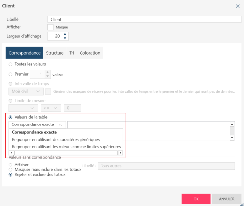 Dans l’onglet Correspondance, sélectionnez l’option de correspondance appropriée.