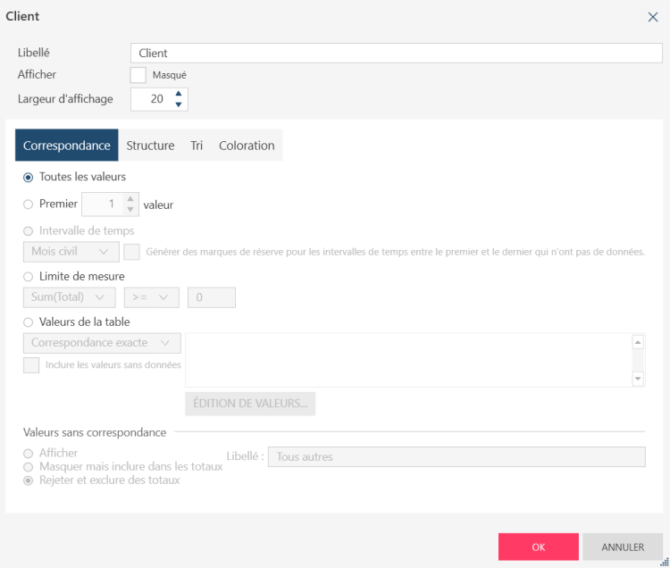 Si vous sélectionnez N premières valeurs, Valeurs de la table ou Limite de mesure, vous avez également la possibilité de grouper toutes les autres valeurs sous un même libellé dans le récapitulatif. Cette fonctionnalité peut être utile en cas de sélection de valeurs de clé spécifiques à comparer à l’ensemble des données.