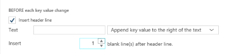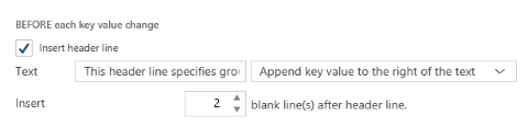 In the Layout tab, go to the section marked BEFORE each key value change, tick the box for Insert header line, and then set a numerical value in Insert n blank line(s) after header line to specify the number of blank lines to add after the header line.