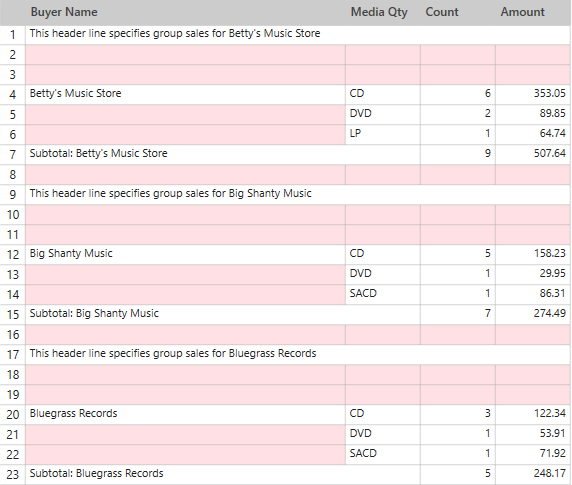 You can add blank lines to a summary to separate logical groups of information. Blank lines are added whenever the value of a selected key field changes. In the following illustration, blank lines are added after every Subtotal line.