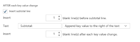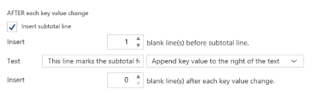 In the Layout tab, go to the section marked AFTER each key value change, ensure that the box for Insert subtotal line is ticked, and then set a numerical value in Insert n blank lines before subtotal line to specify the number of blank lines to add before the subtotal line.