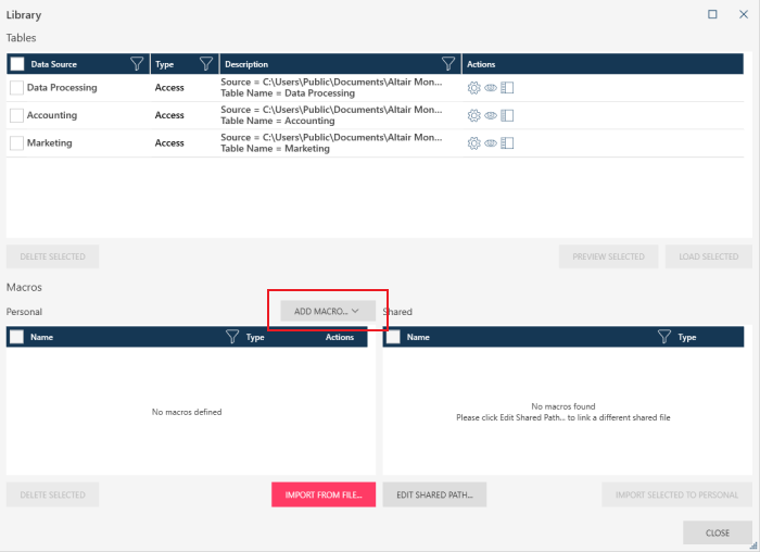 Macros are added to a workspace via the Data Source Library. Access to this library is also provided by: