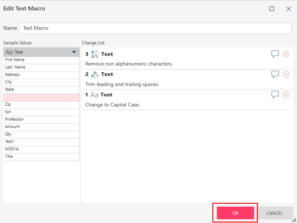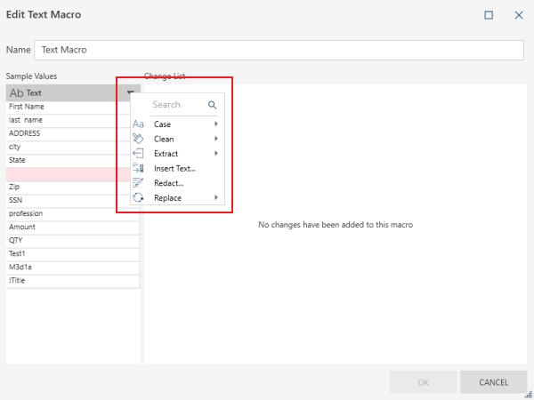 Click the drop-down icon located to the right of the Text field in the Sample Values column and then select a data-prep operation to apply to your text field.