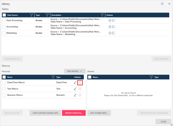 All of the macros you have created display in the Macros list of the Data Source Library.