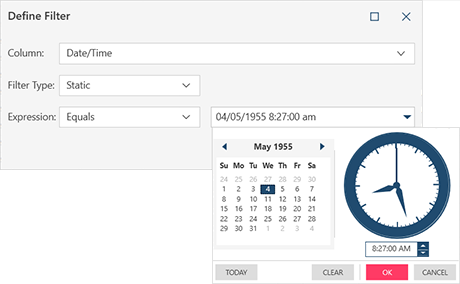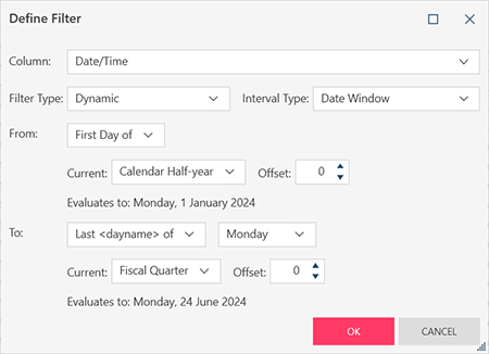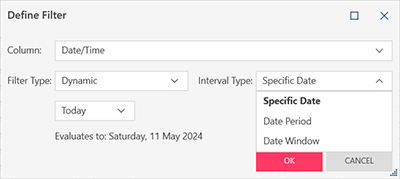 To define a dynamic filter, select the Interval Type (i.e., Specific Date, Date Period, or Date Window) and then build the filter expression by selecting an operator and the date value as required.