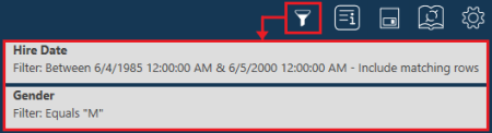 When a filter is defined in the Prepare window, a filter icon displays in the toolbar. Selecting this icon displays the filters applied to a table.
