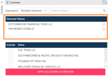 Multiple Selection - This filter operator allows you to filter records of one or more unique string.