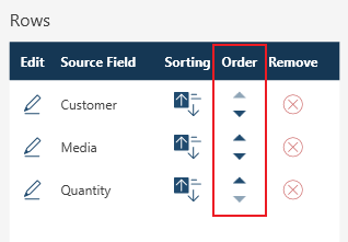 Change the order of values by clicking the Shift Up/Down buttons in the Order column of the Rows/Items/Measures panels.