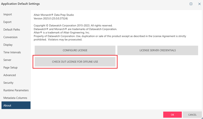 In Data Prep Studio, click Settings > Application Default Settings > About > Check Out License for Offline Use.