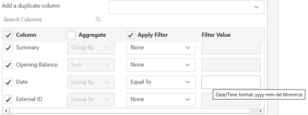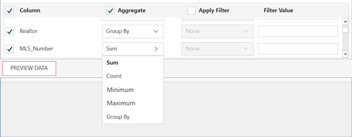 To aggregate columns: If the data returned are to be aggregated, check the Aggregate box on the header, then select the aggregation method you want to use for each column.