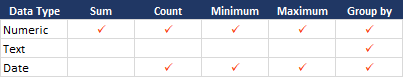 The following aggregation methods are possible for each data type: