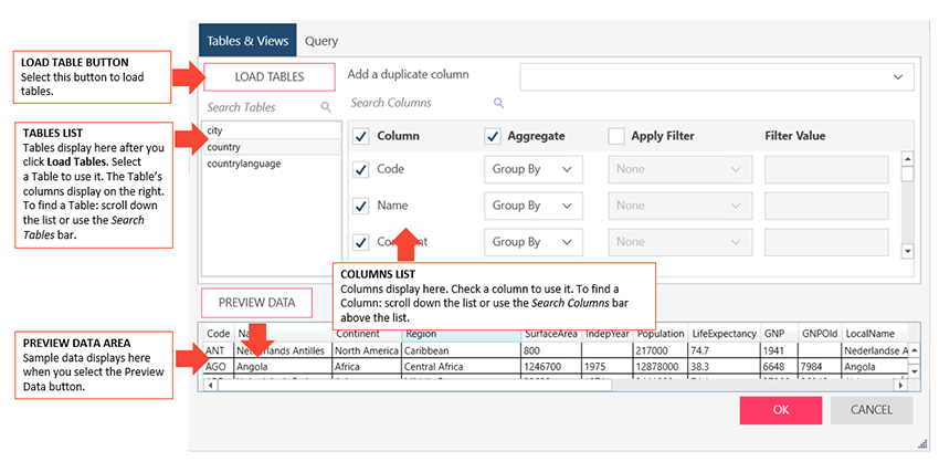 Allows you to load, and then select, the tables from your database by entering a SQL Statement. If you already selected Tables and Views, this box is updated to show the corresponding SELECT * FROM TABLE query.