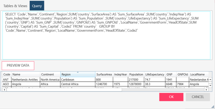 Select OK to establish the connection and fetch data or Cancel to close the dialog. The state of the OK and PREVIEW buttons provides a handy status about the state of your connection: