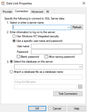 This connector assumes that an OLEDB datasource has been previously created. When selected, the Data Link Properties dialog box displays: