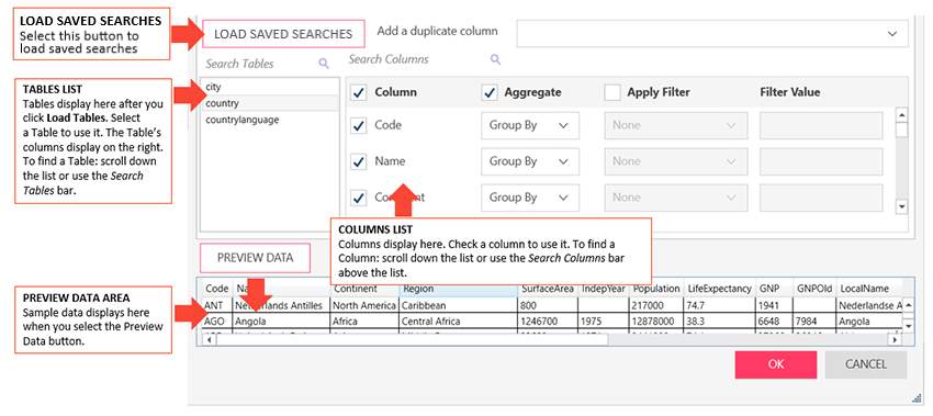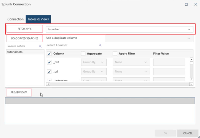 Select OK to establish the connection and fetch data or Cancel to close the dialog. The state of the OK and PREVIEW buttons provides a handy status about the state of your connection: