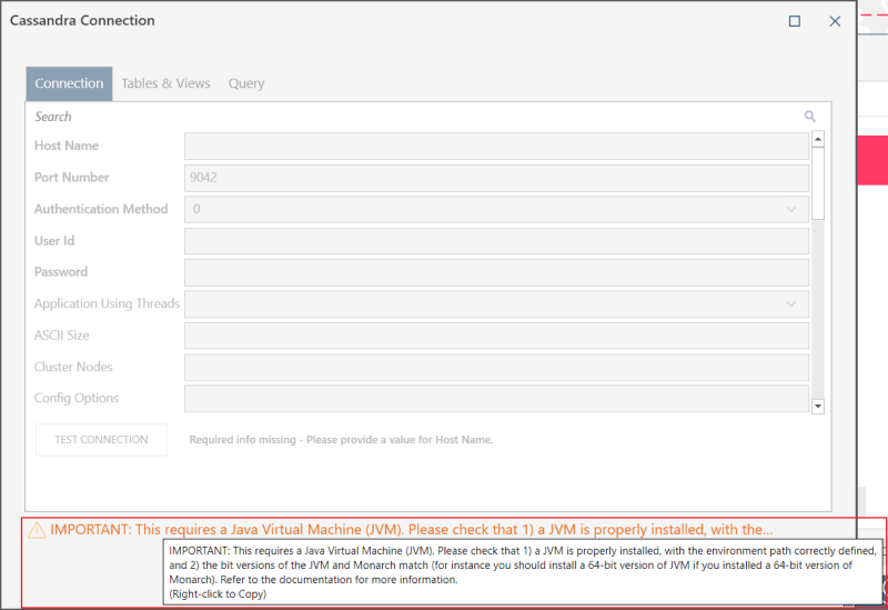 If the required JVM has not been properly configured and the connector is selected from the connectors list, its corresponding dialog displays but is grayed out. A warning line also appears; the full details of this warning can be viewed by hovering your cursor over the line.