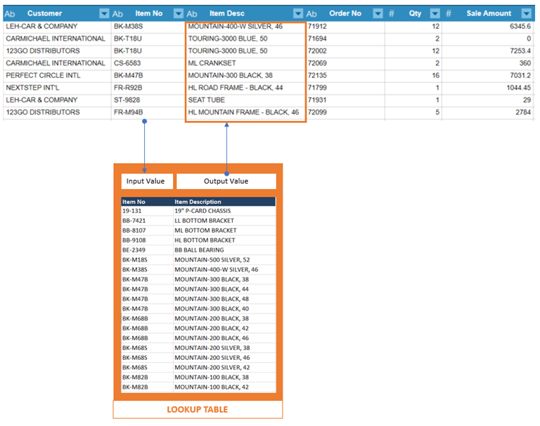 The central control for the lookup field is the lookup table. This is a table where you define the input value/output value pairs. In our example above, the Item Description that matches an Item number.