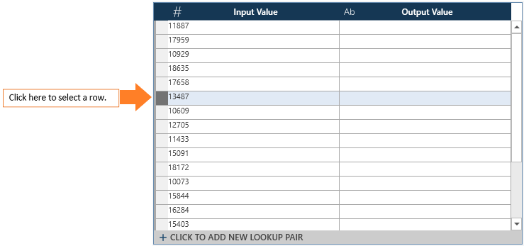 If you do not want to import input values, or if the input values are incomplete, enter the lookup pairs manually. To do so, select + Click to Add a New Lookup Pair at the bottom of the lookup table.