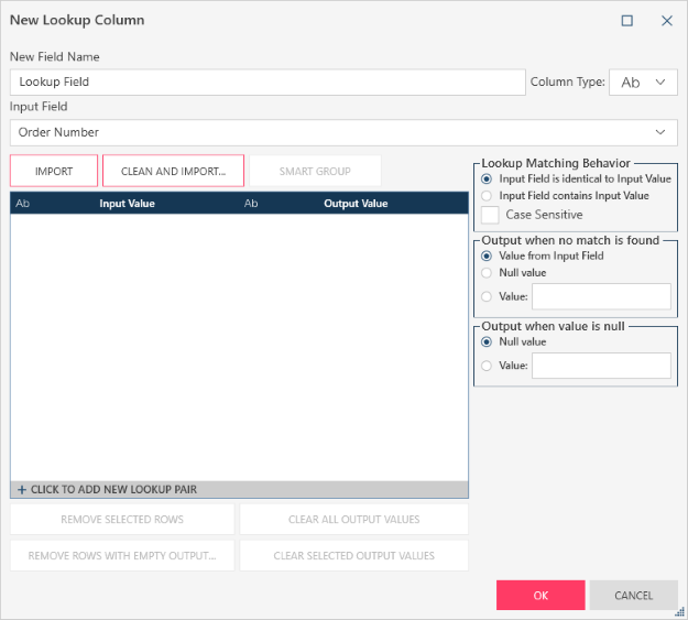 A lookup calculated field provides a convenient table lookup where the value of a designated input field is checked against a lookup table. If a matching input value from the lookup table is found, then the corresponding output value is used. If no matching value is found, then the output is either the same as the input value, null or a default value. Comparisons can be case-insensitive or case-sensitive.