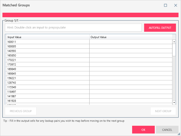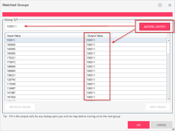 Select any of the input values as the mapping or output value and then click Autofill Output to apply the selection to the group.