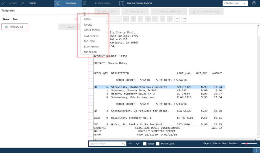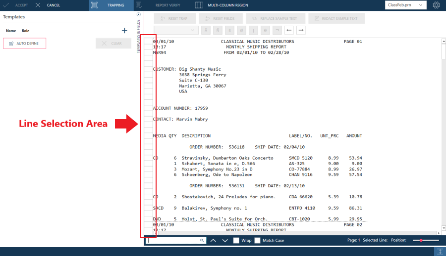In some reports, the detail fields are arranged on more than one line, e.g., a block of text. As well, occasionally, there may be no unique features that identify the first line of a block of text. If it is impossible to use line 1, select another line that has unique features. In this case, you need to indicate which of the sample lines to trap on via the Trap Line option.