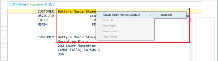 The fields identified by your trap are automatically highlighted. To add a field to your table, highlight this field in the sample line, right-click on your mouse, and then select Create Field from this Capture > <Field Name>.