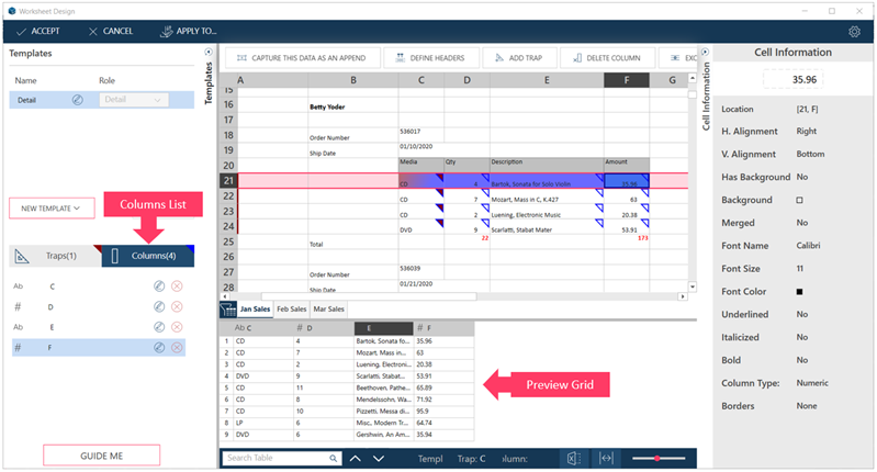 .As you add columns, the column definition is added to the Columns List and sample data is displayed on the Preview Grid: