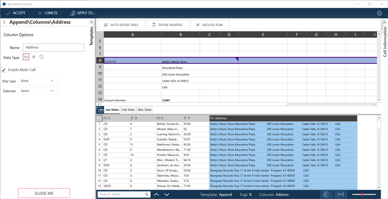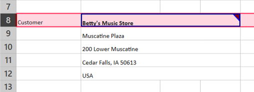 Sometimes you need to pick up column values that span several cells, like the address on this worksheet: