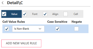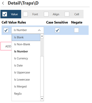 The Value tab allows you to define traps according to the values in a cell. Value Rules are the following: