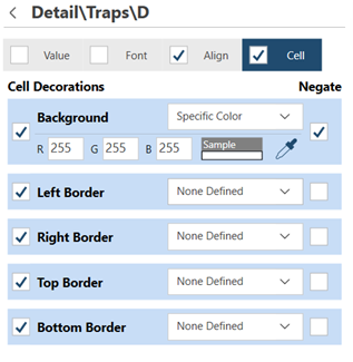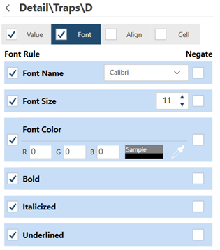 Select the Font, Align, or Cell tabs to edit Font, Alignment, or Cell Format trapping rules.