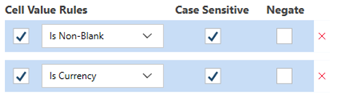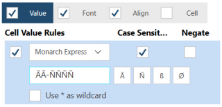 Value of the cell must contain a string of alphanumeric characters that you set. When you select this rule a text box will ask you to set the Contains value. |