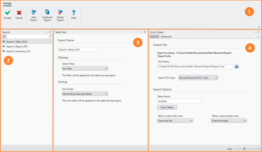 Export Design allows you to create or edit exports. You go to this mode within Export View.