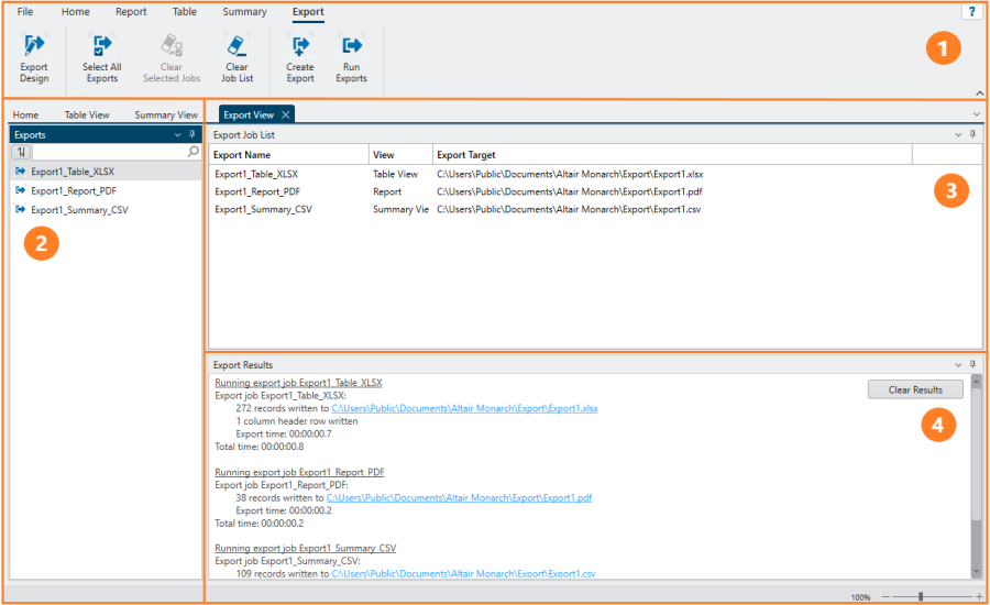 Ribbon Display all the tools you need to work with an export. Refer to the Export View Ribbon Quick Reference. |