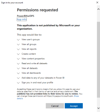 The export operation is executed and the Power BI Export login dialog displays.