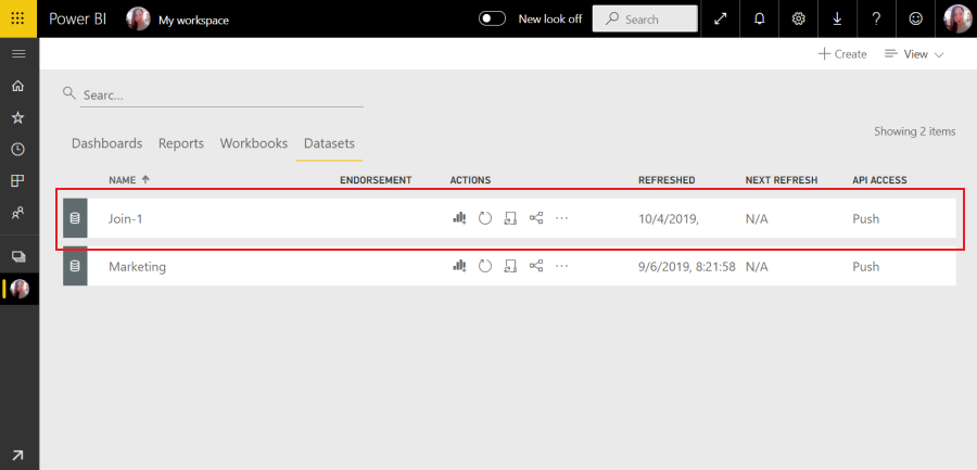 If you log into your Microsoft Power BI account and access your workspace, the exported table should display in the Datasets list.