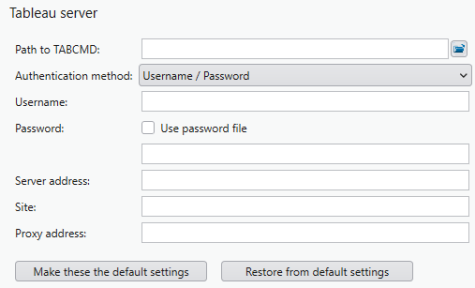 The folder in which TABCMD, a command line utility supplied by Tableau that performs various operations in Tableau Server/Cloud, is installed. This setting is required. Note: This utility must be installed to access Tableau Server/Cloud. The path to this file can only be configured through the Security tab of the Options window. |