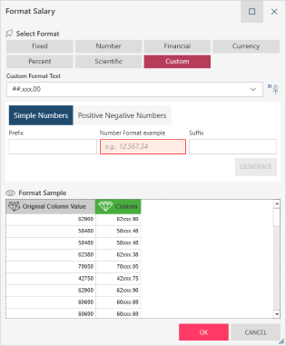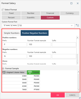 To format positive, negative, and zero numbers, ensure that the Positive Negative Numbers tab is selected and then specify a format example and desired prefix and/or suffix for positive, negative, and zero numbers. Click the Generate button to produce a sample of what your numbers will look like when your selected formatting is applied. Note that the Generate button is disabled when a custom format has not been specified for a specific number type (positive, negative, and zero) or when alpha or special characters are inputted in any of the Number Format example fields in this tab.