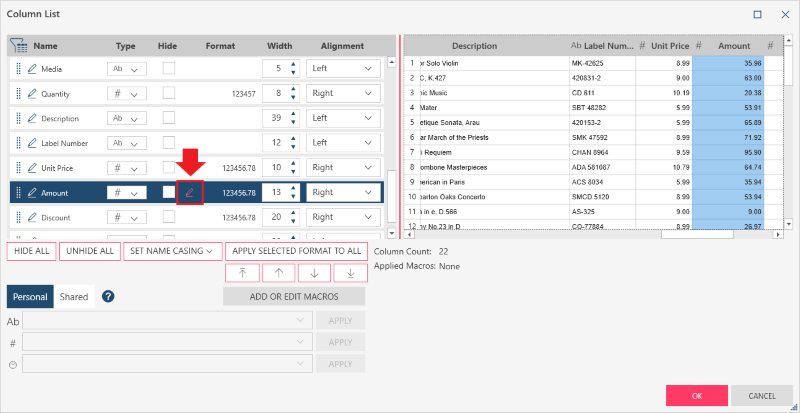 Click on the Edit Format icon beside the numeric column you wish to format: