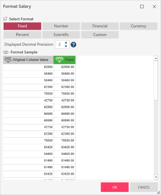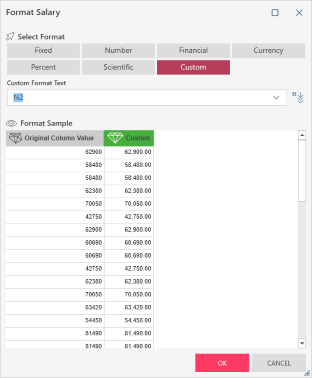 Select one of the pre-defined formats (Fixed, Number, Financial, Currency, Percent, Scientific) to apply these formats to your numeric columns. Alternatively, select Custom to enter your own custom formatting: