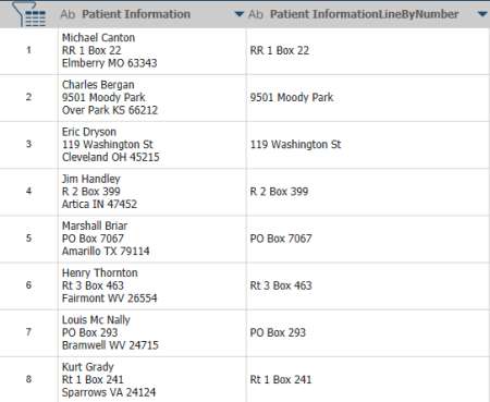 In this example, Patient Information is the original column containing a text block. Extracting line #2 from the text block produces the values in Patient InformationLineByNumber.