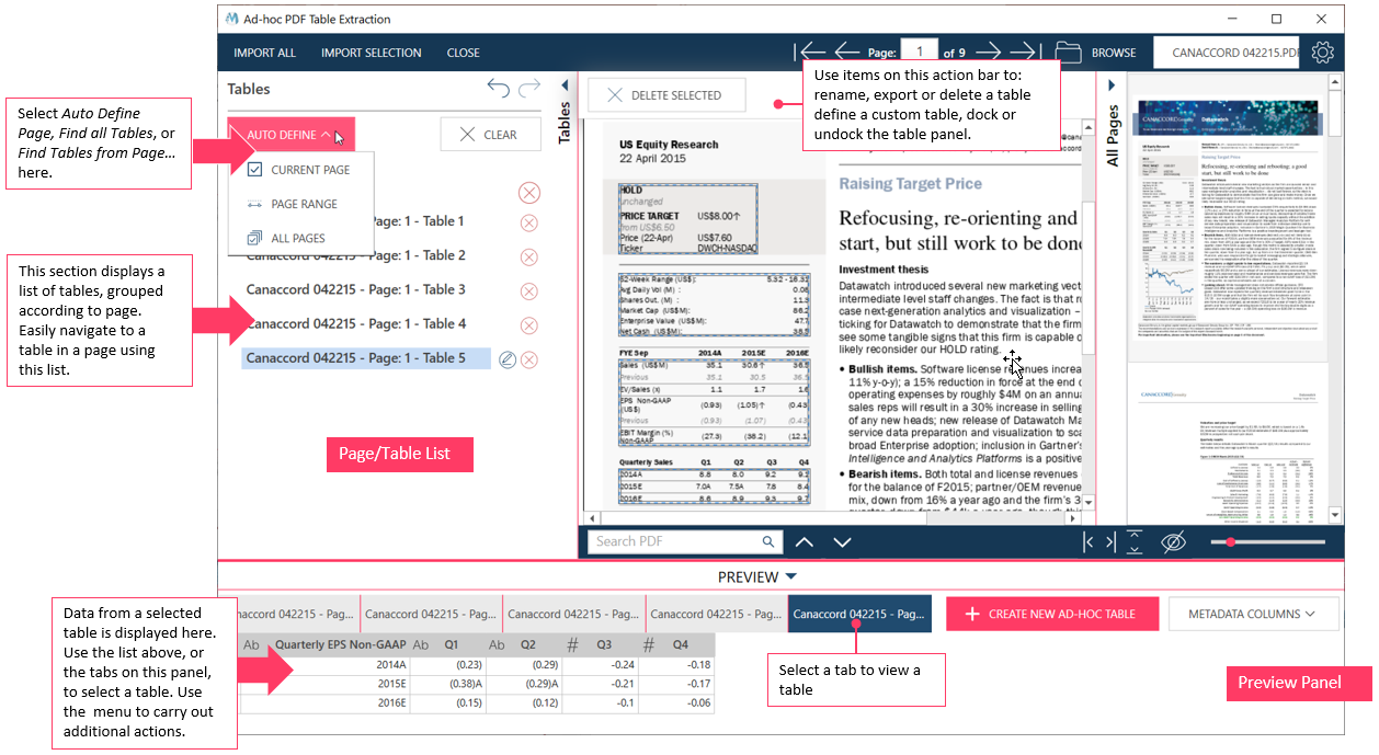 Auto Define > All Pages looks for and then automatically defines all tables in the entire document. Note that this process may take time, especially if you have many tables and many pages..
