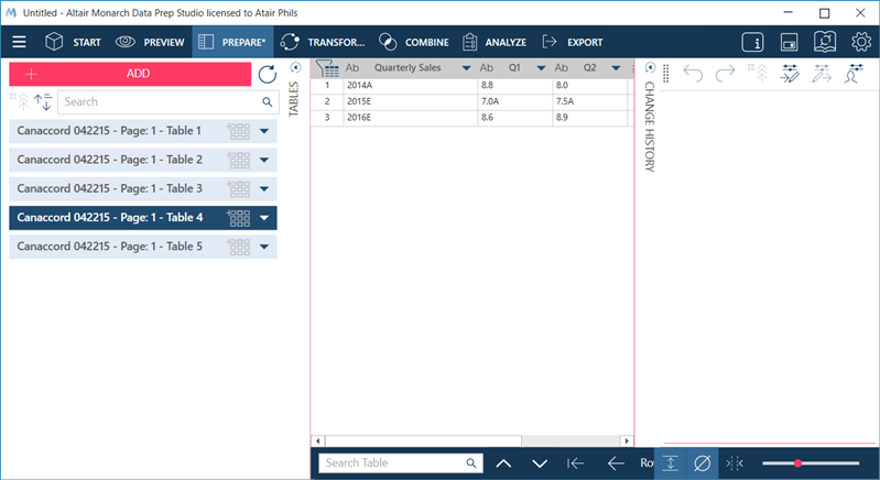 After defining your tables in PDF Table Extractor, you can import them to Monarch Data Prep Studio. Once the tables are imported and loaded, you can work on them like you would any table in Monarch Data Prep Studio.