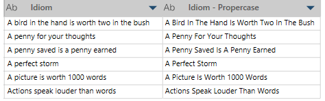 In this example, Idiom is the original column and Idiom - Propercase shows the new values, with all words in the description converted to proper case.